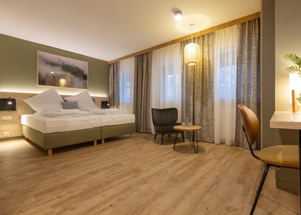 Jedes Zimmer verfügt über ein hochwertiges Boxspringbett, eine gemütliche Sitzgelegenheit mit Schreibtisch sowie einen Flat-Screen-TV. Die moderne Wohlfühldusche, WC, Föhn und das kostenfreie WLAN sorgen für zusätzlichen Komfort. Eine atmosphärische Ambientebeleuchtung rundet das harmonische Wohngefühl ab.